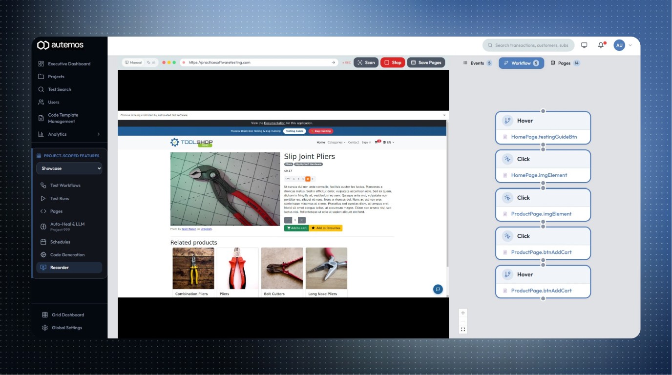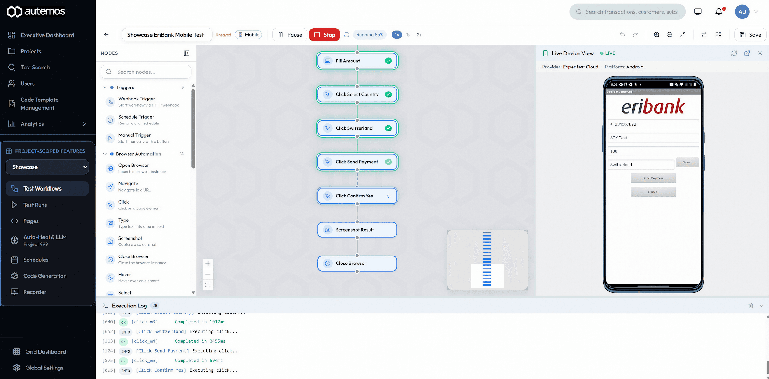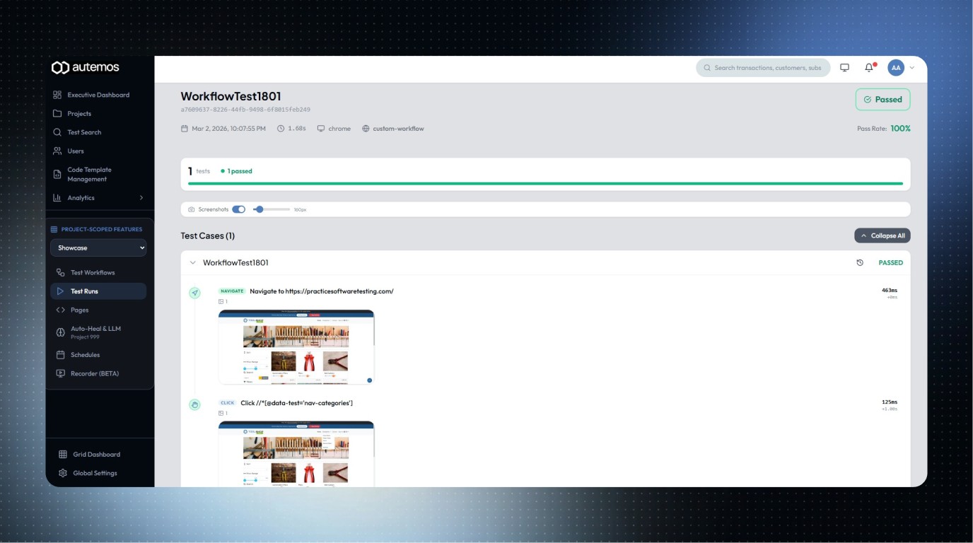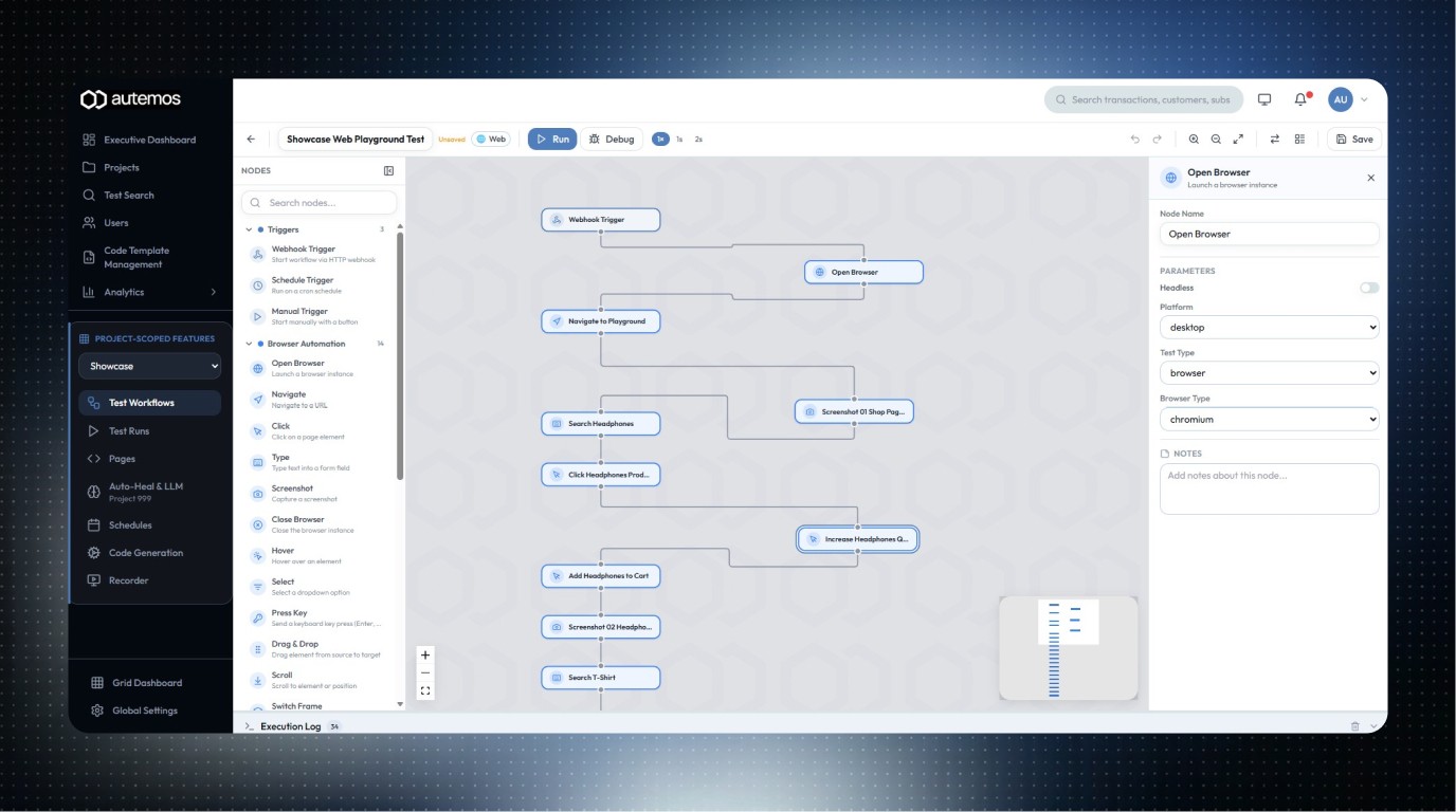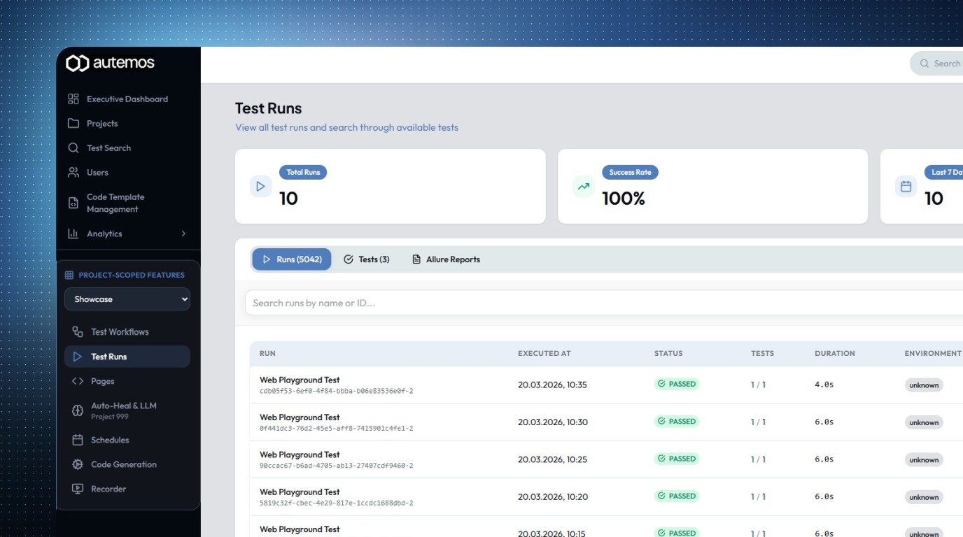 Autemos verbindet KI-gestützte Testautomatisierung, visuelle Test Workflows und echten Code in einer Plattform. Fachbereiche erstellen Tests schnell und Engineers behalten die volle Kontrolle.