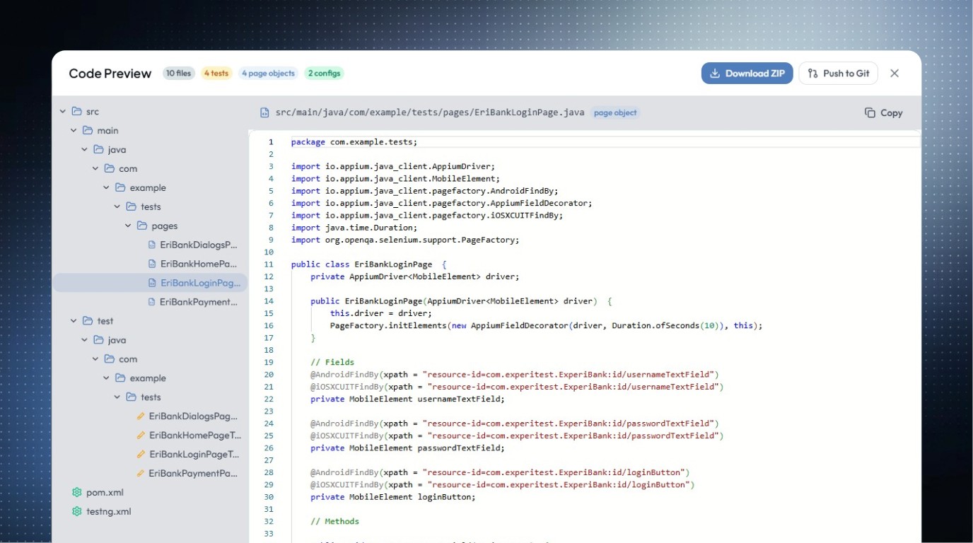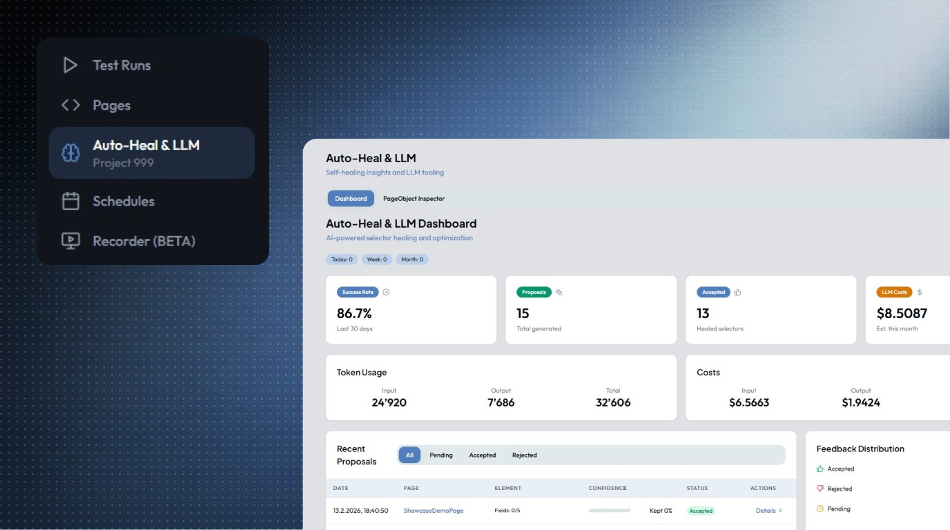 Der AI Recorder erstellt strukturierte, ausführbare Test-Workflows inklusive KI-generierter Page Objects. Das Team prüft jeden Schritt und gibt ihn frei. Human-in-the-Loop: KI arbeitet vor, dein Team entscheidet — kein blinder Automatismus.