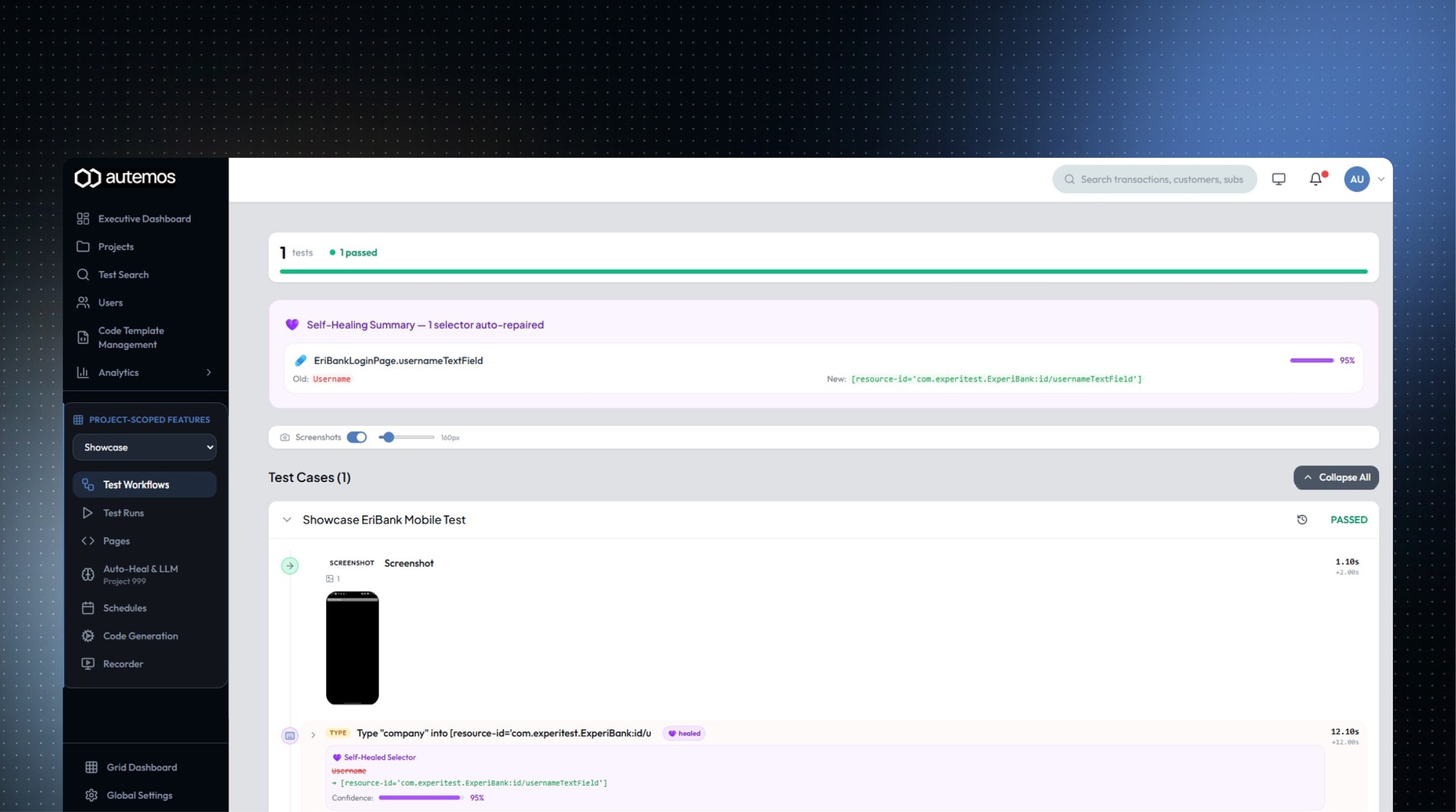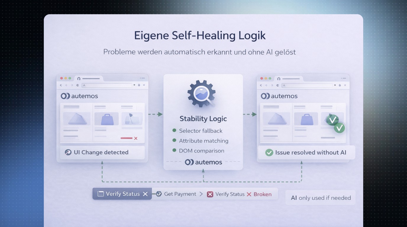 Autemos stabilisiert Tests automatisch, nutzt zuerst eigene Logik und greift nur bei Bedarf auf KI zurück. Jede Anpassung wird transparent im Testreport dokumentiert.