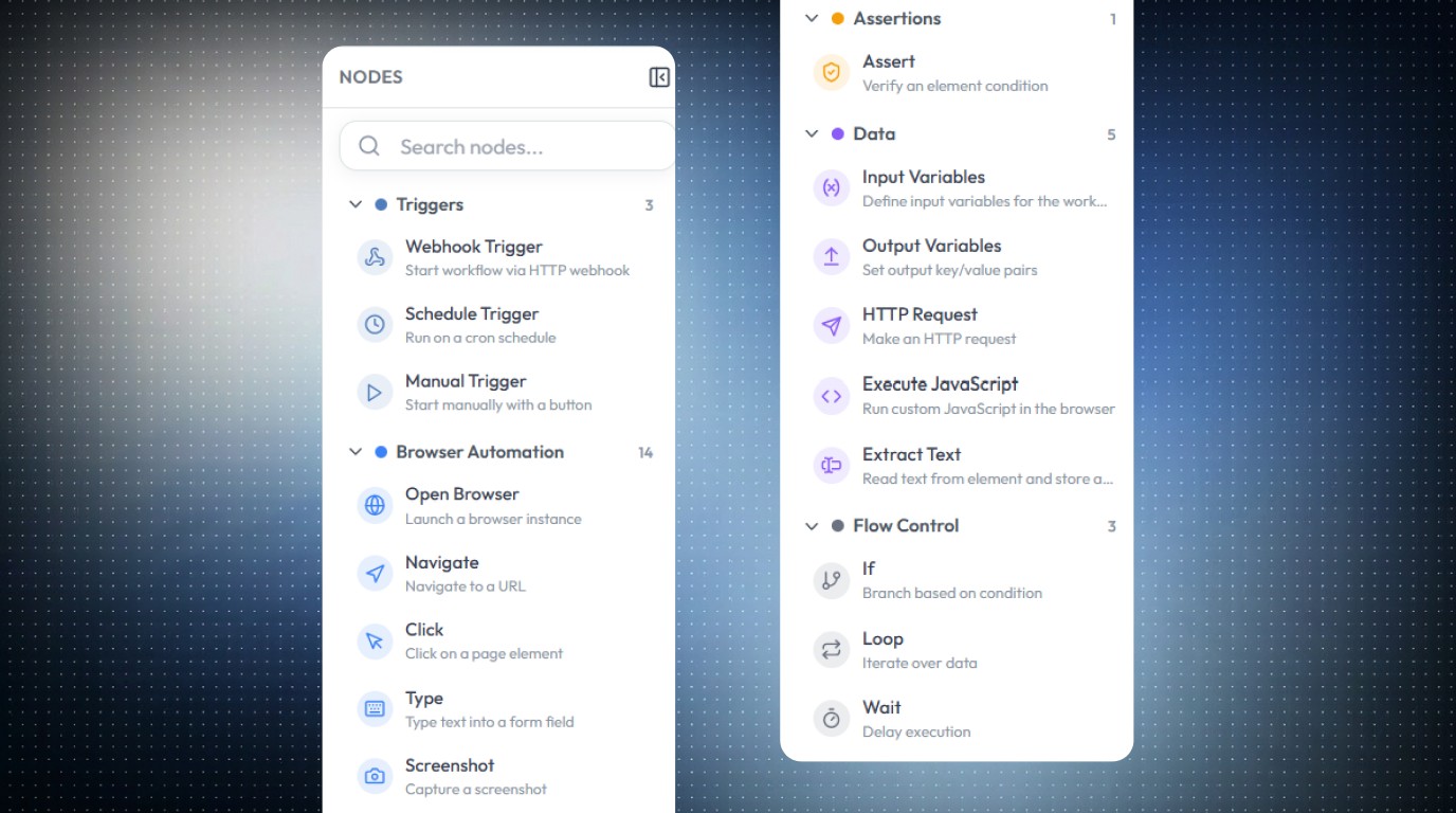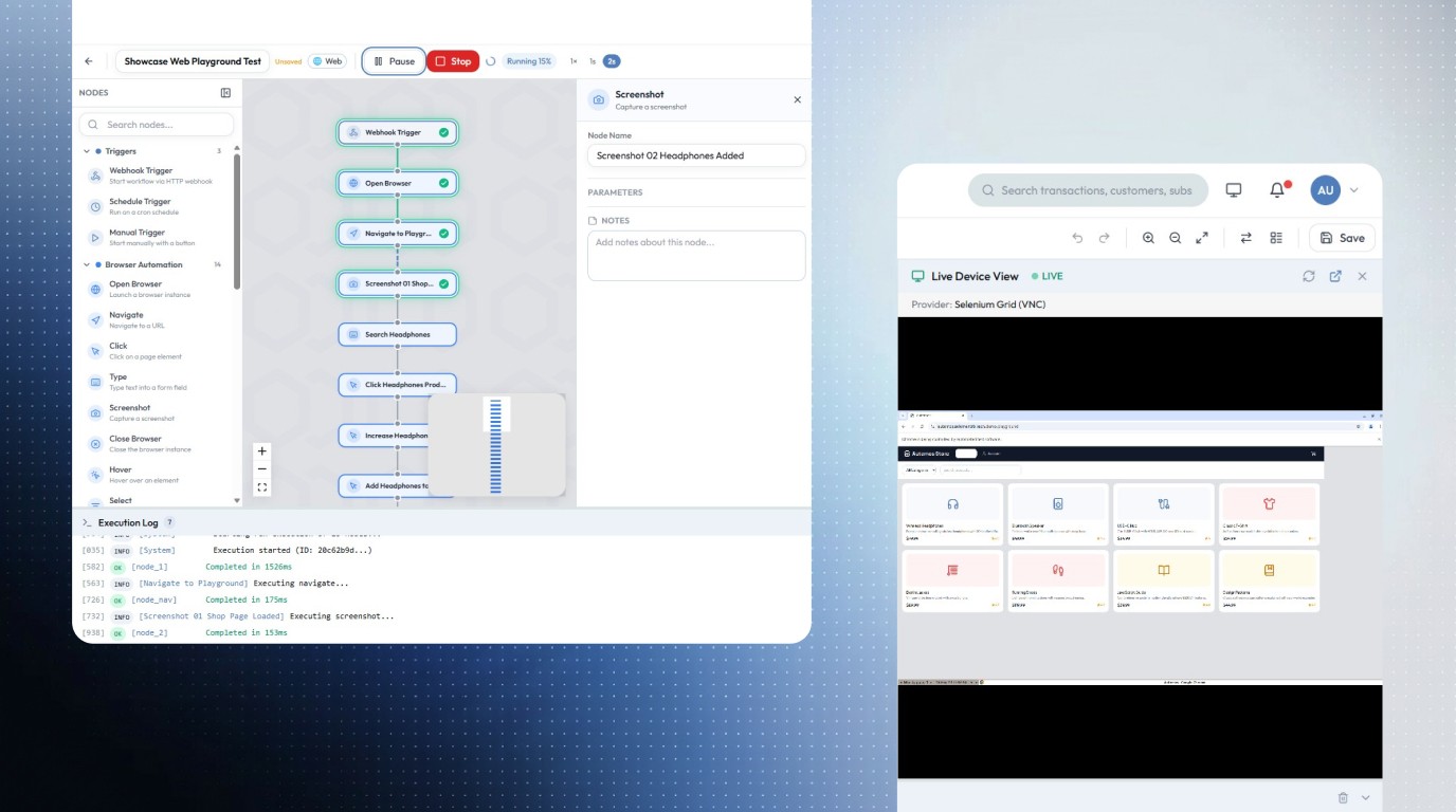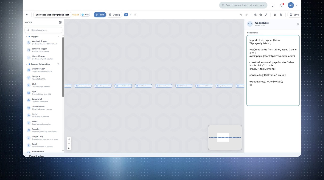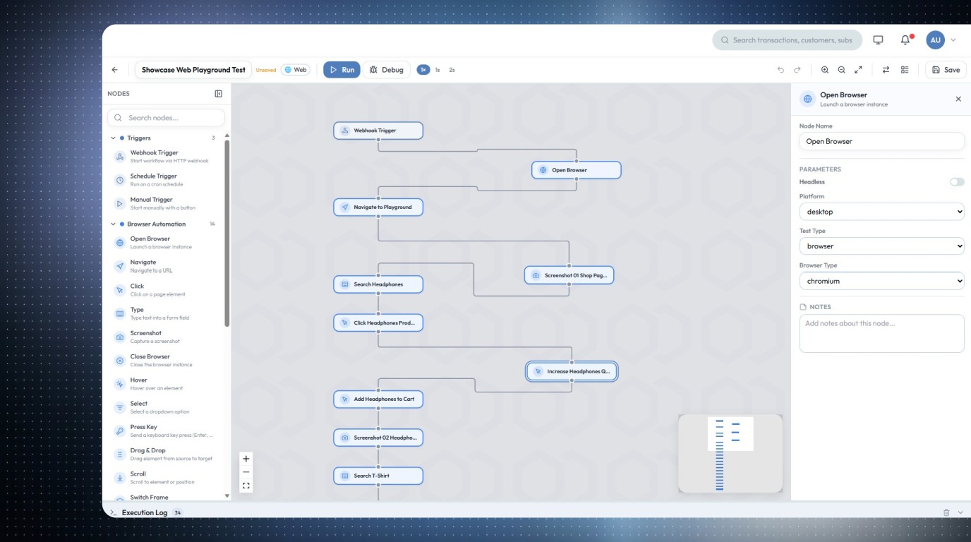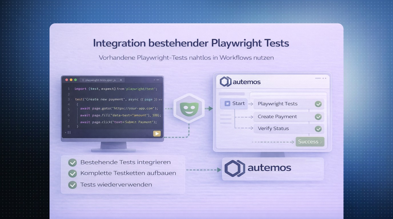 Fachbereiche bauen Testabläufe über eine geführte Oberfläche, während Engineers komplexe Szenarien mit Code oder bestehenden Playwright-Tests erweitern können.